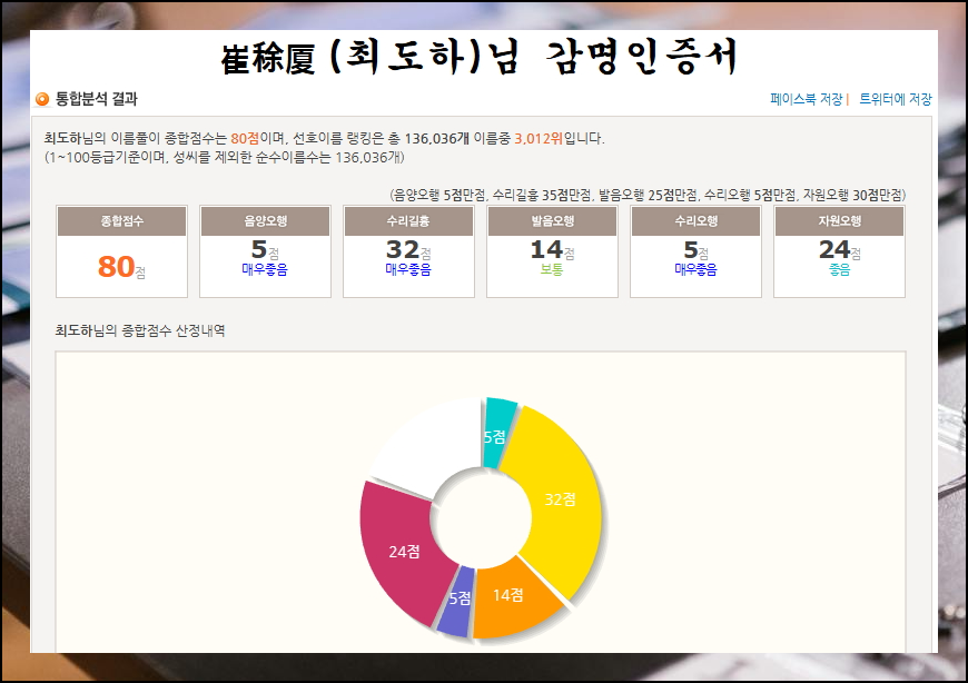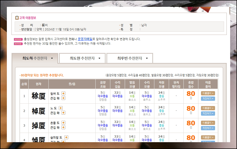 이름 풀이 기능으로 작명 결과를 확인해보세요. 감명인증서까지 받아볼 수 있어요. 여기에는 성명 분석 결과와 선호도 순위가 포함됩니다. 체계적인 방법으로 평가가 이루어지죠.