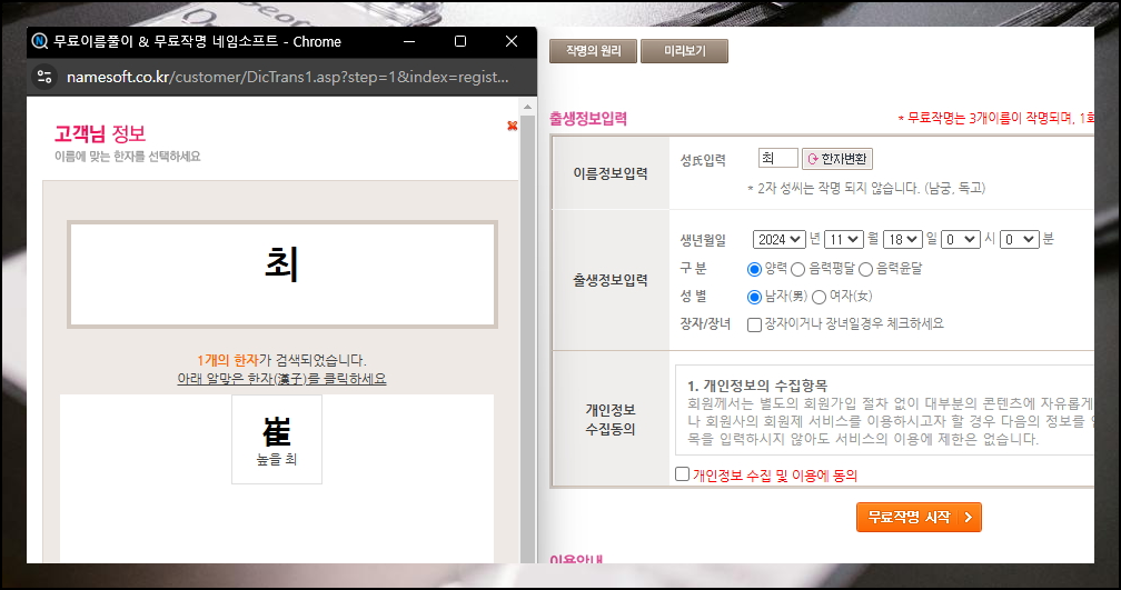 작명을 위한 첫 번째 과정는 한자로 된 성씨를 입력하는 거예요. 이름을 짓기 위해 생년월일과 같은 출생 정보를 입력합니다. 특히 장남이나 장녀 여부를 정확하게 입력하는 것이 중요하죠.