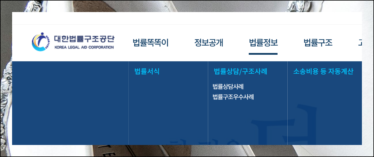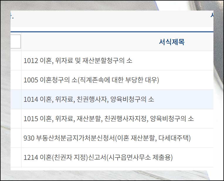 법률구조공단 사이트의 메인 메뉴에서 법률정보 → 법률상식을 차례로 선택하세요. 검색창에 "이혼"을 입력하면 관련 양식을 모두 확인할 수 있어요. 미리 어떤 내용을 담고 있는지 볼 수 있도록 "바로보기" 서비스를 제공하고 있습니다. 어떤 자료를 선택해야 할 지 고민이 되는 경우 해당 서비스를 이용해주세요.
