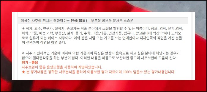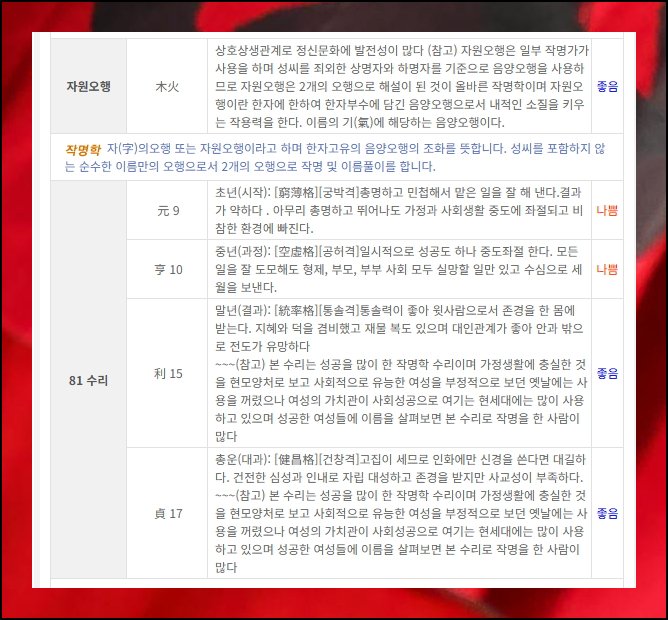 사람의 성명에 사용하면 좋지 않은 한자들이 따로 정해져 있어요. 처음 작명할 때 이런 금기 사항을 반드시 고려해야 하는데요. 사이트의 이름풀이 기능을 쓰면 내 명칭에 불용한자가 들어갔는지 간단히 확인 가능해요. 성명학 원리에 따른 부모님 성함과의 조화 여부도 체크할 수 있고요. 주역학의 관점에서 해석한 풀이까지 제공되니까 이 부분도 놓치지 말고 참고해 보시길 바랍니다.