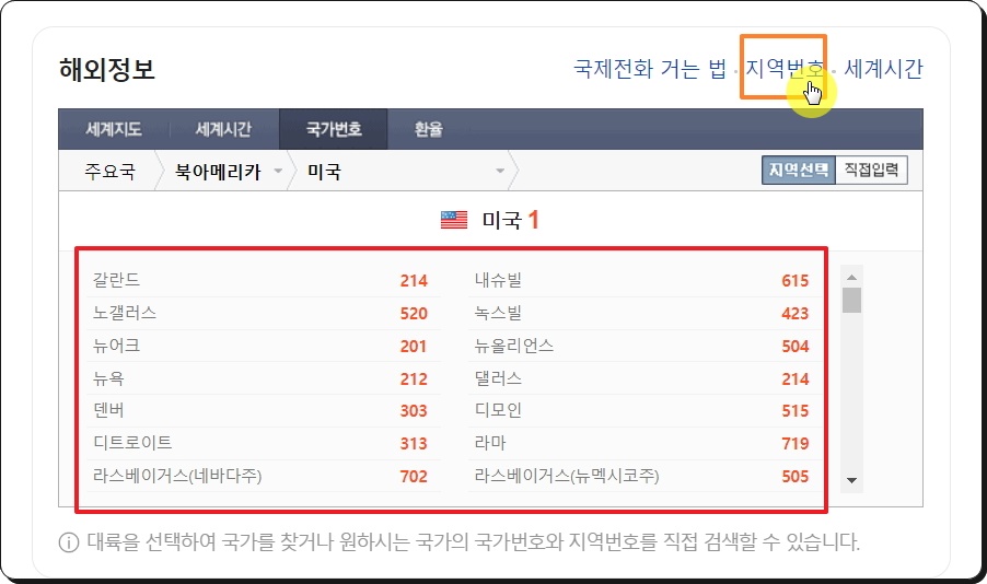 제가 말한 추가 정보는 바로 지역번호 입니다. "미국"에 대한 국가코드를 선택하니 각 지역에 할당이 된 지역코드 리스트가 나오네요. 요즘에는 휴대폰을 많이 사용하기 때문에 잘 쓰이지 않지만, 그래도 필요할 때가 있을 수 있으니 참고하시길 바랍니다. 해당 화면에서 표를 기준으로 우측 상단에 있는 [지역번호] 링크를 클릭해 보세요.