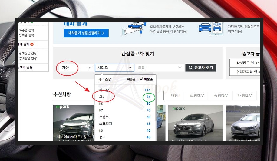 관심 있는 차량에 대한 내용을 지정해야 해요. 당연히 제조사는 기아를 선택하고, 시리즈는 모닝으로 지정하면 돼요. 매물 수를 확인해 보세요. 해당 사이트에서 기아 모닝에 대한 매물이 94대나 됨을 알 수 있어요.
