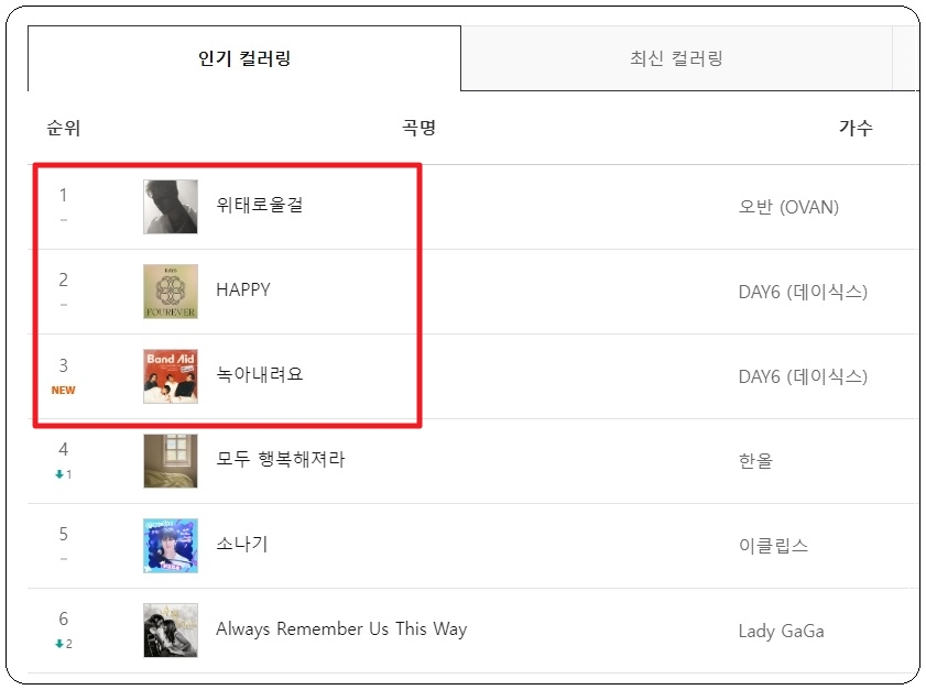 많은 사람들에게 좋은 평가를 받는 노래나 인기 순위는 매번 바뀔 수 밖에 없습니다. 그렇기 때문에 매번 새롭게 업데이트가 되는 컬러링 순위를 확인하는 것이 좋은데요. 일단 현재 기준으로 1위부터 18위에 해당하는 인기 컬러링 리스트를 조회해 보았습니다. 오반, DAY6, 한올, 이클립스, 레이디 가가 등 노래 잘 부르는 가수들의 곡이 많이 보이네요.