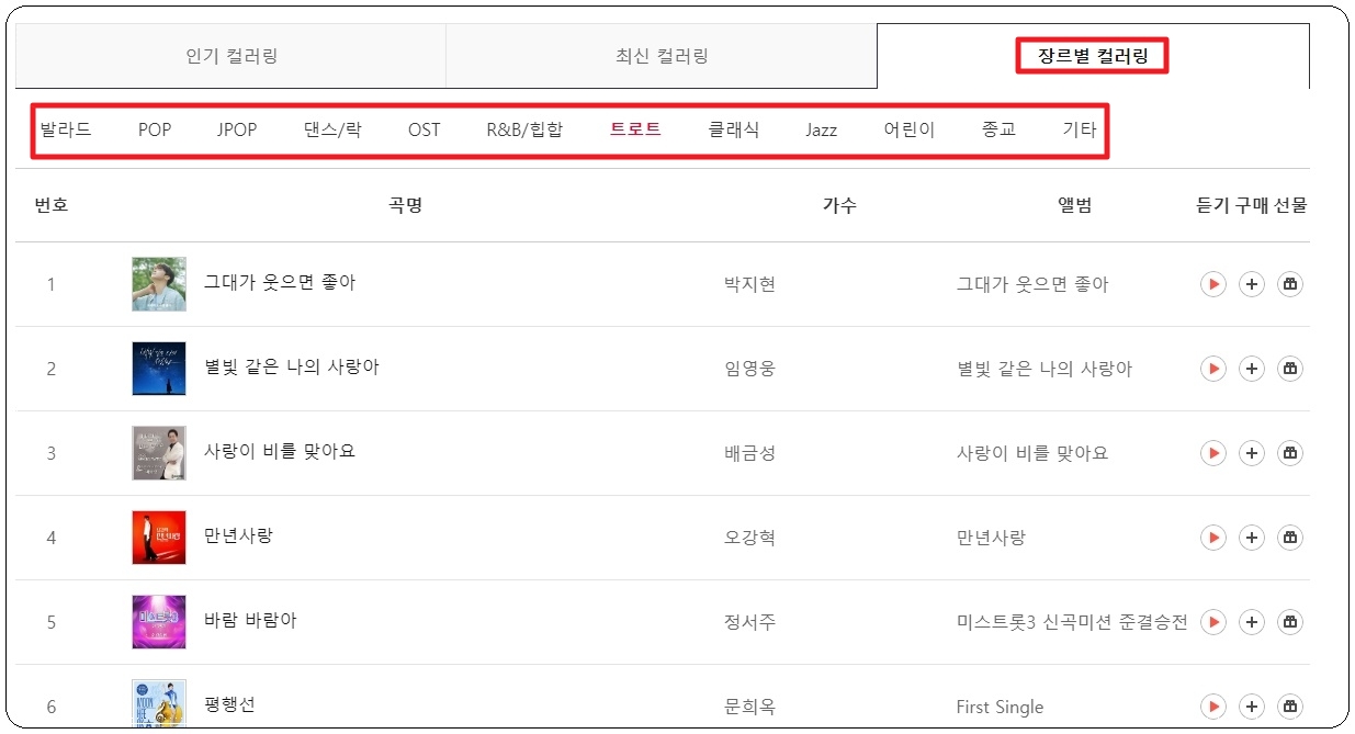 사람마다 좋아하는 노래의 장르가 다른데요. 그런 경우를 대비하여 발라드, POP, JPOP, 댄스, 락, OST 등 장르 선택을 통해 각 장르마다 인기 좋은 노래를 확인할 수 있습니다.