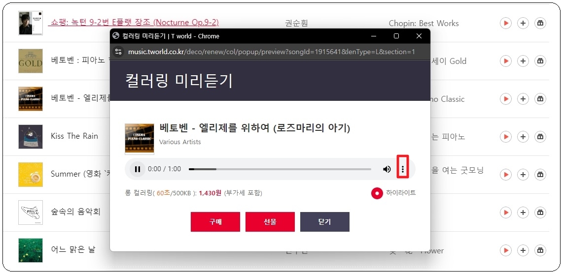 각 음원 옆에 보면 재생 버튼이 있는데요. 해당 버튼을 클릭해 보세요. 그럼 컬러링 음원을 미리듣기 할 수 있는 창이 나타납니다. 이것을 통화연결음으로 사용할 때 얼마의 비용을 내야 하는지 명확하게 표시되어 있죠. [구매] 버튼을 누르면 자신의 폰에 설정하는 것이고, [선물] 버튼을 통해 남에게 선물을 해줄 수 있습니다. 이러한 선물을 받으면 기분이 좋을 것 같아요.