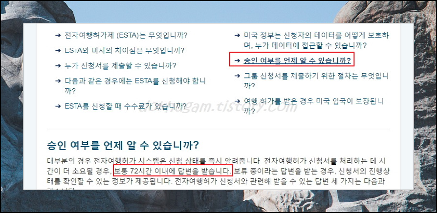 esta 도움말을 잠깐 볼께요. 일반적으로 전자여권 미국 비자 신청을 한 이후 결과를 즉시 받을 수 있는데요. 시간이 좀더 걸리는 경우에는 보통 72시간 내에 답변을 받을 수 있답니다. 물론 esta 신청을 할때 문제가 생기면 보류중이라고 답변이 오는 경우도 있답니다.