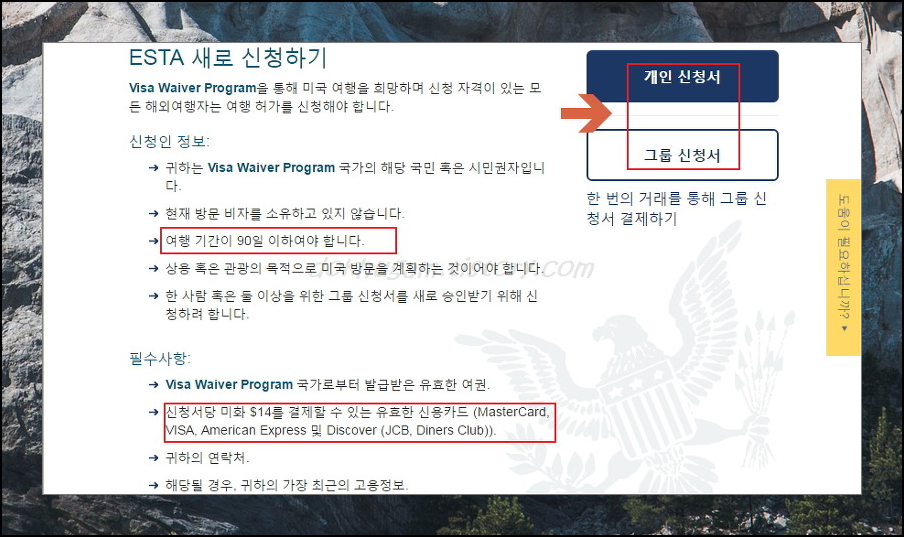 개인 신청서를 눌러주세요. 인터넷으로 전자여권 미국 비자를 신청하실 때 도움되는 정보가 있네요. 여행기간이 90일 이하여야 하고, 신청하는데 드는 비용은 $14로 매우 저렴한 편이랍니다. (시기와 물가에 따라 상승 가능)