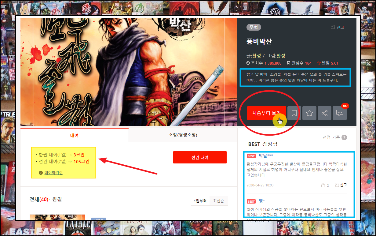 사이트 화면에서 [처음부터 보기] 버튼을 누르면 바로 감상이 가능합니다. 여기에 나온 줄거리나 감상평을 참고하면 보고 싶은 무협만화를 찾는 데에 도움이 됩니다. 좌측 하단에 보면 대여를 할 때 코인이 필요하다고 하는데요. 무로로 코인을 얻는 방법이 있습니다. 그 부분은 아래에 있는 이전 글을 참고하시길 바랍니다.