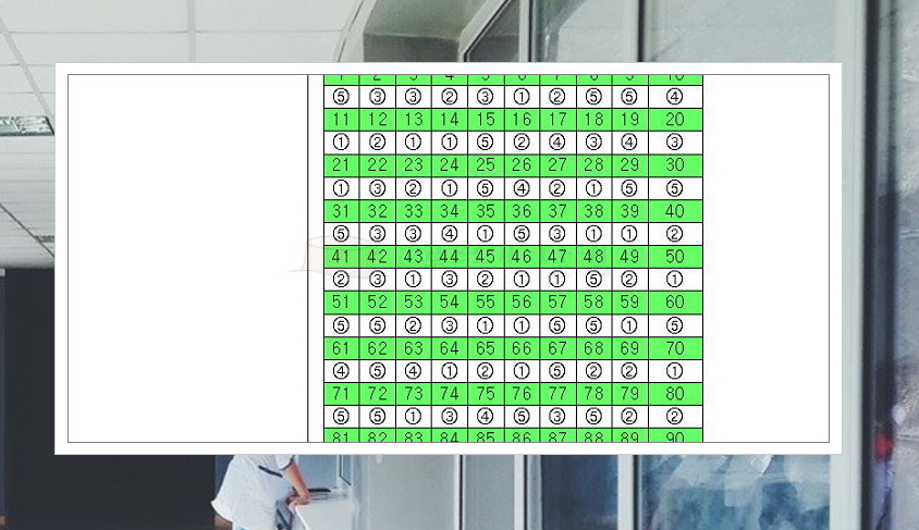 6) 모두 풀었으면 마지막 장에 정답이 있으니 채점을 해보세요. 매 과목 만점의 40퍼센트 이상을 맞추고, 총점의 60퍼센트 이상을 득점해야 합격입니다.