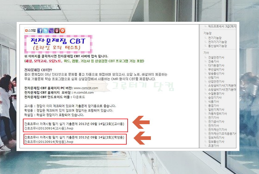 1) 100분 동안에 100개의 객관식 문제를 풀어야 되는 간호조무사 시험은 기초간호학 개요, 보건간호학 개요, 공중보건학개론, 실기 과목으로 구성되어 있습니다. comcbt 사이트에서 시험문제 자료를 구할 수 있는데요. 어떻게 이용하는지 알려드리겠습니다. 일단 접속해 볼께요.