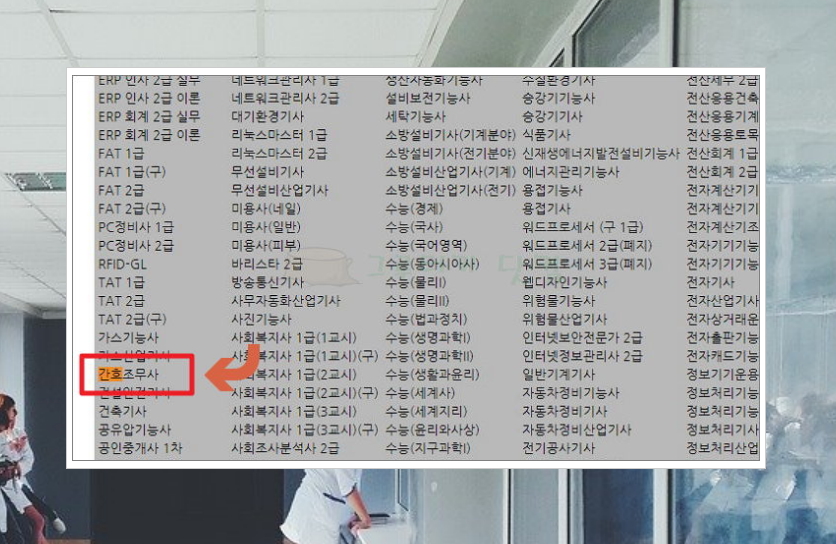 2) 사이트에 접속하면 다양한 자격증의 시험문제를 다루고 있음 알 수 있는데요. 왼쪽 아래를 보면 간호조무사가 있습니다.