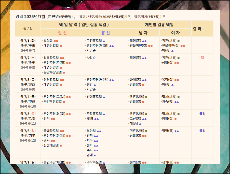 입력을 완료하면 택일 달력이 화면에 표시됩니다. 각 날짜별로 길신과 흉신의 영향을 쉽게 파악할 수 있어요. 결과창을 보면 특정 날에 결혼식을 올리는 것이 좋은지 나쁜지 바로 알 수 있습니다. "불리"라고 표시된 날은 피하는 것이 좋고, "길"이나 "대길"로 나타난 날은 좋은 기운이 함께하는 날이에요. 이렇게 결혼 날짜 잡는법이 생각보다 간단합니다.