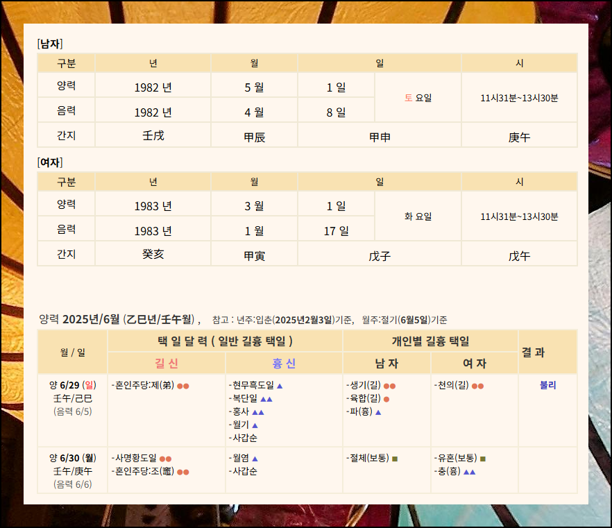 이처럼 길한 날과 흉한 날을 구분하는 것은 생각보다 어렵지 않아요. 온라인 택일 서비스를 잘 활용하면 누구나 쉽게 좋은 일정을 찾을 수 있습니다. 복된 날을 선택해서 행복한 결혼 생활의 첫걸음을 기분 좋게 나아가시길 바라도록 할께요.