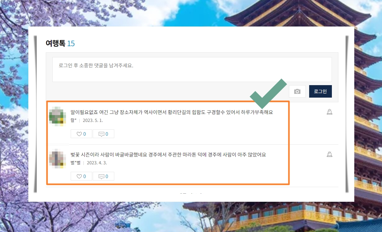 4. 바로 여러 가지 여행 정보가 나타났는데요. 여기서 인기순으로 정렬을 하면 만족도 높은 게시물을 우선적으로 살펴볼 수 있어요. 저는 "빛으로 빛나는 경주의 야간투어 추천코스"가 눈길을 끄는데요. 정말 아름다웠던 기억이 납니다.