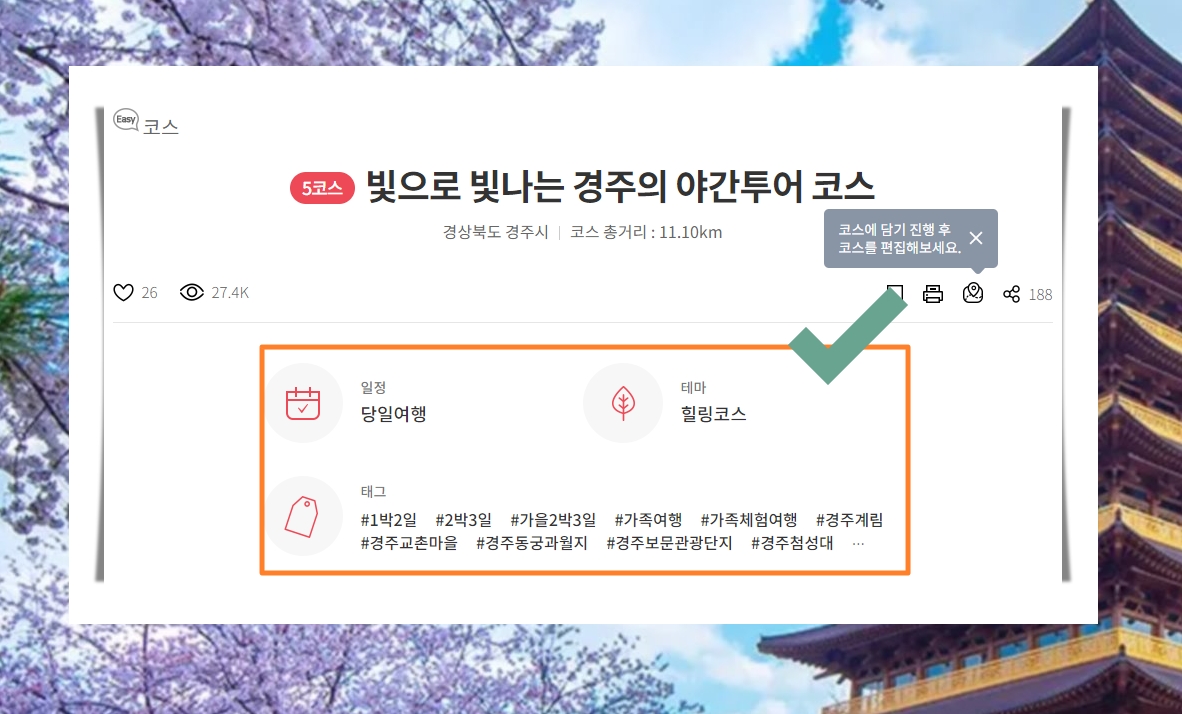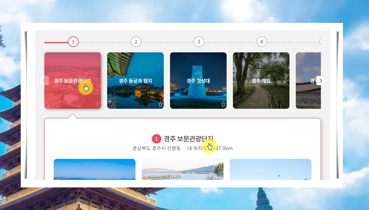 5. 제가 선택한 것은 당일여행도 가능하고, 1박 2일이나 2박 3일 동안 경주에서 여행을 할 때에도 사용이 가능한 관광 추천코스입니다. 테마가 힐링에 속하는 것을 보니 마음의 안정을 얻고 싶은 분들에게 딱이겠네요.