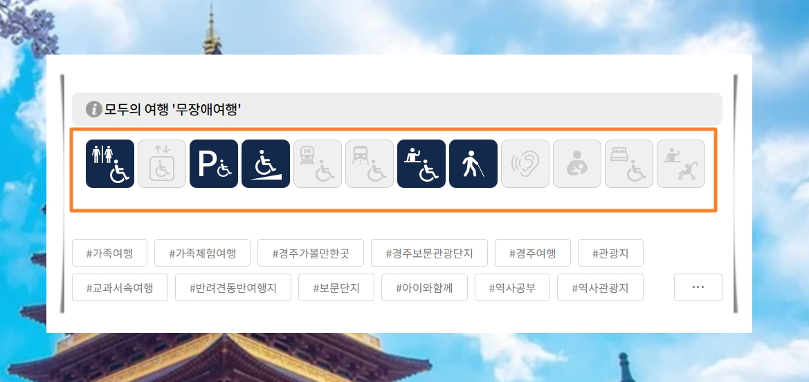 10. 모두가 만족하는 여행이 되기 위해서 필요한 무장애여행 관련 정보도 제공하고 있는데요. 여러 가지 시설에 대하여 아이콘으로 멋지게 표시를 해놓았네요.