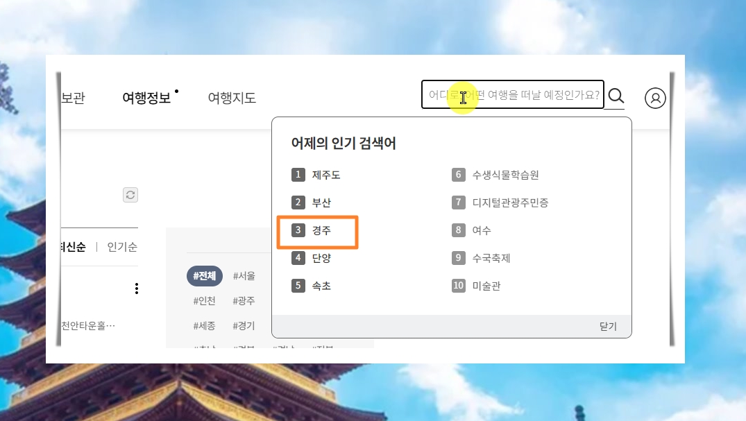 3. 경주 지역에 한에서만 관광을 하고 싶고, 이에 관련된 추천코스를 받고 싶다면 검색 기능을 이용해 보세요. 사이트 화면에서 우측 상단에 보면 검색창이 있는데요. 역시 인기 검색어 순위에 3위를 차지할 정도로 경주가 인기 지역임을 알 수 있습니다.