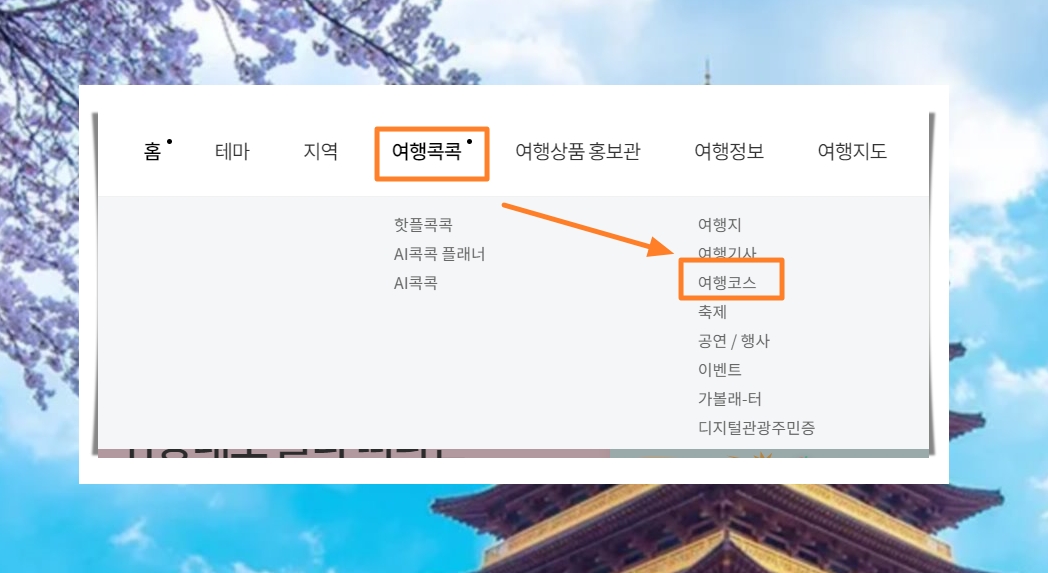 2. 사이트에 접속하면 메뉴에서 여행콕콕에 마우스 커서를 올려보세요. 그럼 엄청나게 많은 국내 여행코스를 추천 받을 수 있는 서비스를 선택할 수 있습니다.