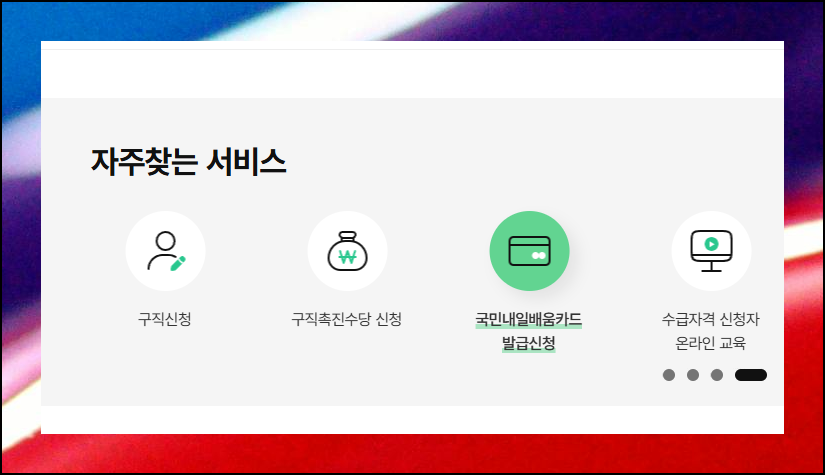 이곳에서 내일배움카드 발급 신청은 물론, 다양한 훈련 코스 검색과 수강접수까지 한 번에 해결할 수 있어요. 교육 관련 모든 서비스가 한 곳에 모여 있어 정말 편리하답니다. "자주 찾는 서비스" 카테고리를 보면 쉽게 신청 메뉴를 찾을 수 있어요.