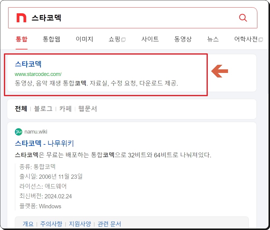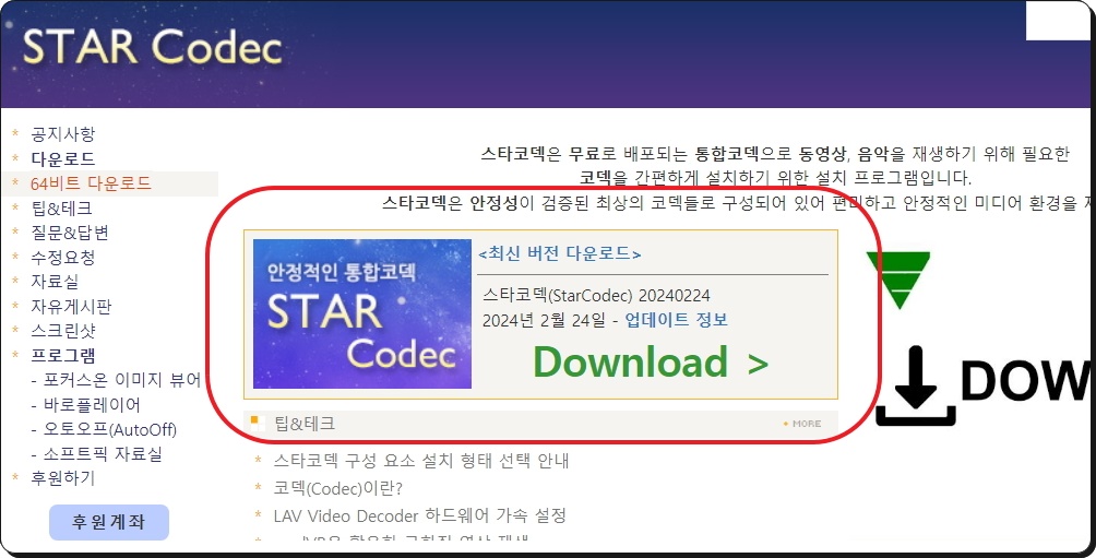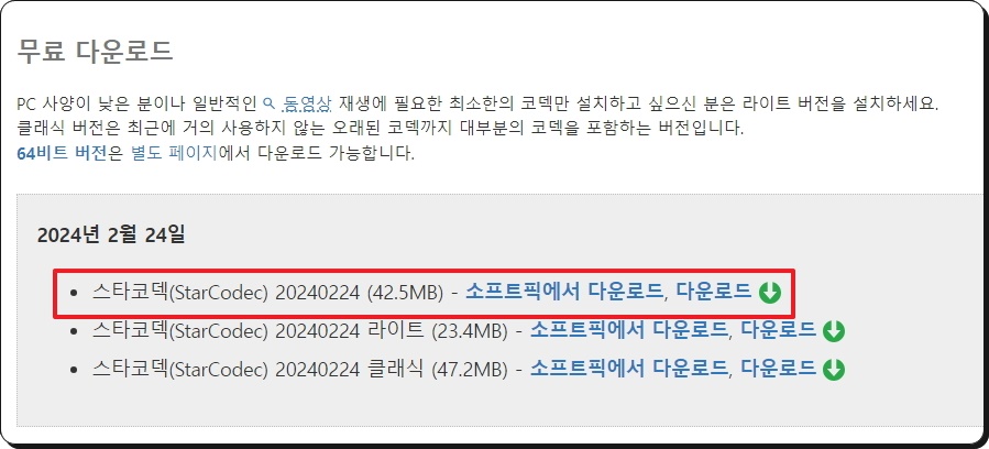 스타코덱의 경우에는 공식 홈페이지를 통해 최신 버전의 통합코덱 설치 프로그램을 다운로드받을 수 있는데요. 저처럼 소프트웨어의 이름만 검색하면 쉽게 공식 홈페이지에 접속할 수 있습니다. 처음 접속하게 되면 최신 버전인 2024년 2월 24일에 업데이트된 프로그램을 다운로드받을 수 있는 버튼을 발견할 수 있습니다.