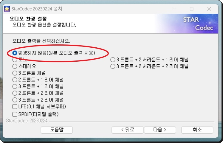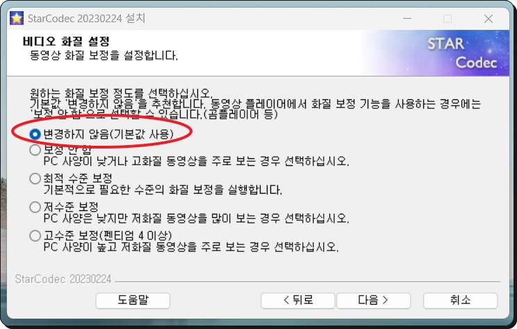 설치 형태를 자신의 컴퓨터 사용 환경에 맞게 지정했다면 이번에는 오디오 환경 설정을 진행해 주세요. 그다음으로는 비디오 화질도 설정해야 하는데요. 잘 모르는 경우라면 기본값 사용을 선택하시면 됩니다. 곰플레이어의 경우에는 화질 보정 기능을 사용할 수 있는데요. 이 경우에는 [보정 안함]을 선택하면 돼요. 마지막 단계에서도 추천 프로그램을 설치할 것인지 물어보는데요. 이러한 것들이 필요하면 체크해 주시고 그렇지 않다고 생각하면 체크를 해제하시면 됩니다.