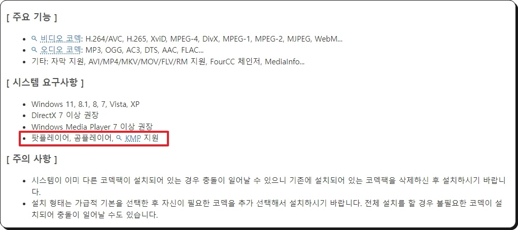 우리가 이번 시간에 다운로드 받아 설치할 통합코덱에 대한 몇 가지 주요 내용에 대해 짚고 넘어가 보겠습니다. 일단 이것은 곰플레이어를 이용하여 비디오와 오디오 파일을 재생함에 있어서 문제없이 진행되도록 도움을 줍니다. 윈도우 운영체제에서 설치할 수 있고 DirectX나 윈도우 미디어 플레이어의 버전을 권장사항 수준으로 업데이트해 주는 것이었습니다. 시스템 요구사항에 나와 있듯이 곰플레이어를 지원하고 있는 통합코덱 입니다.