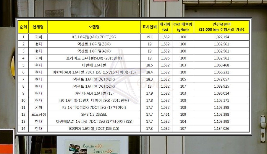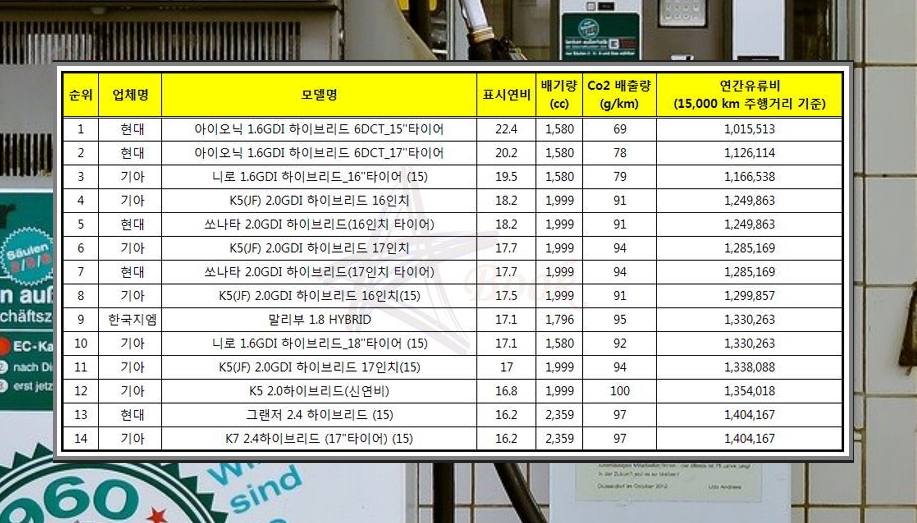 이번 시간에는 국산차 기준으로 연비 순위 자료를 보여 드리려고 하는데요. 조금 지난 자료이지만, 현재 와서 크게 달라진 점은 없을 거예요. 참고 정도만 하시기 바랍니다.