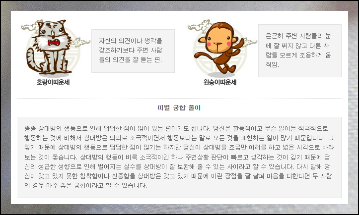사이트에서 제공하는 띠별 궁합은 명확한 기준으로 관계를 분석해줘요. 예를 들어 호랑이와 원숭이는 찰떡궁합이라는 사실, 알고 계셨나요?