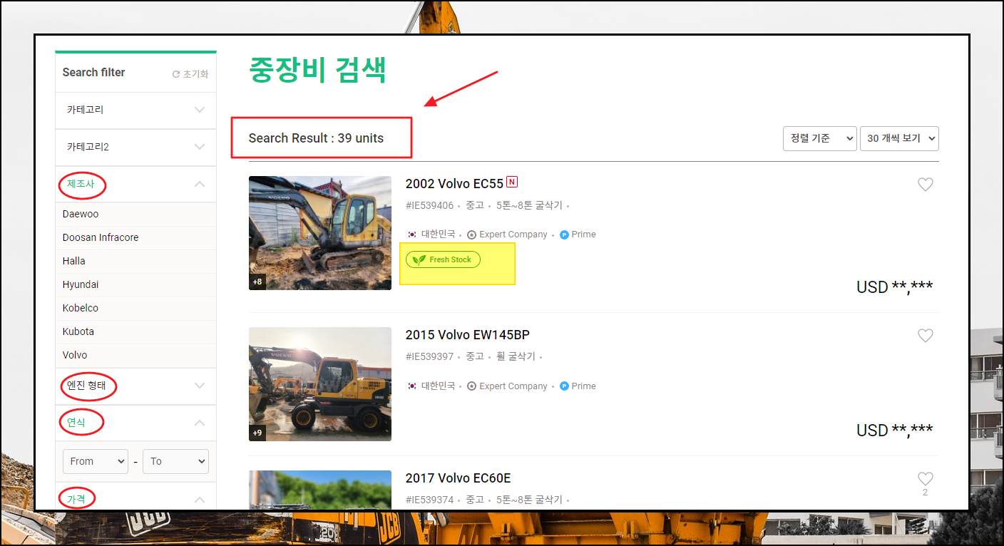 중장비 검색을 통해 굴삭기를 검색해 보았는데요. 39개의 매물이 나왔습니다. 좌측에 보면 엔진 형태, 연식, 제조사, 가격을 기준으로 상세 조건 검색이 가능하여 자신에게 맞는 것을 찾기에 용이하게 되어 있습니다.