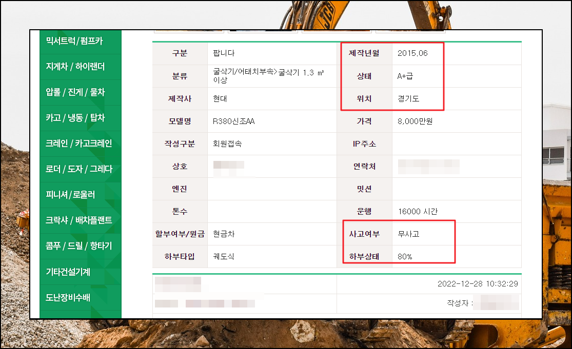 그린중기 매매상사 사이트에서 관심 있는 매물을 선택해 보세요. 그럼 좀 더 상세한 스펙 확인이 가능합니다. 여기서 주의해야 할 점은 사고 여부입니다. 중장비 특성상 위험한 환경에 노출이 쉽기 때문에 기기에 문제가 있으면 큰 피해를 받을 수 있기 때문입니다. 여기에 더하여 그린중기 매매상사 사이트에서 확인할 수 있는 운행 시간과 하부상태를 꼼꼼히 살펴보시는 것이 좋습니다.