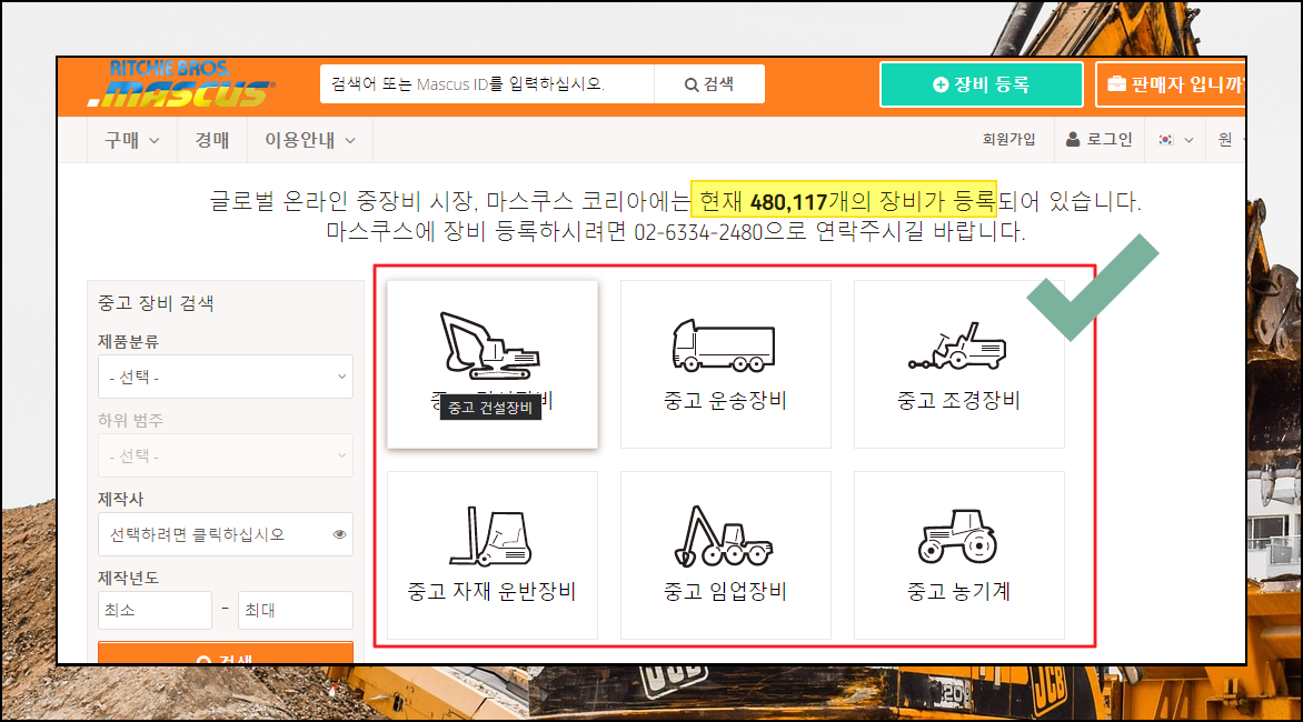 마스쿠스 코리아 사이트에 접속했습니다. 간단하게 중고 장비 검색 기능을 통해 여러 중기 매물을 찾아볼 수 있는데요. 현재 48만개의 장비가 등록되어 있다고 합니다. 자신이 가지고 있는 중기를 이곳에서 판매하는 것도 가능합니다. 크게 중고인 건설장비, 임업장비, 자재 운반장비, 농기계, 조경장비, 운송장비로 분류가 되는데요. 무료로 진행할 수 있는 회원가입을 하게 되면 검색어 저장, 구매 희망 광고 게제, 판매 제의 등의 서비스를 이용할 수 있습니다.