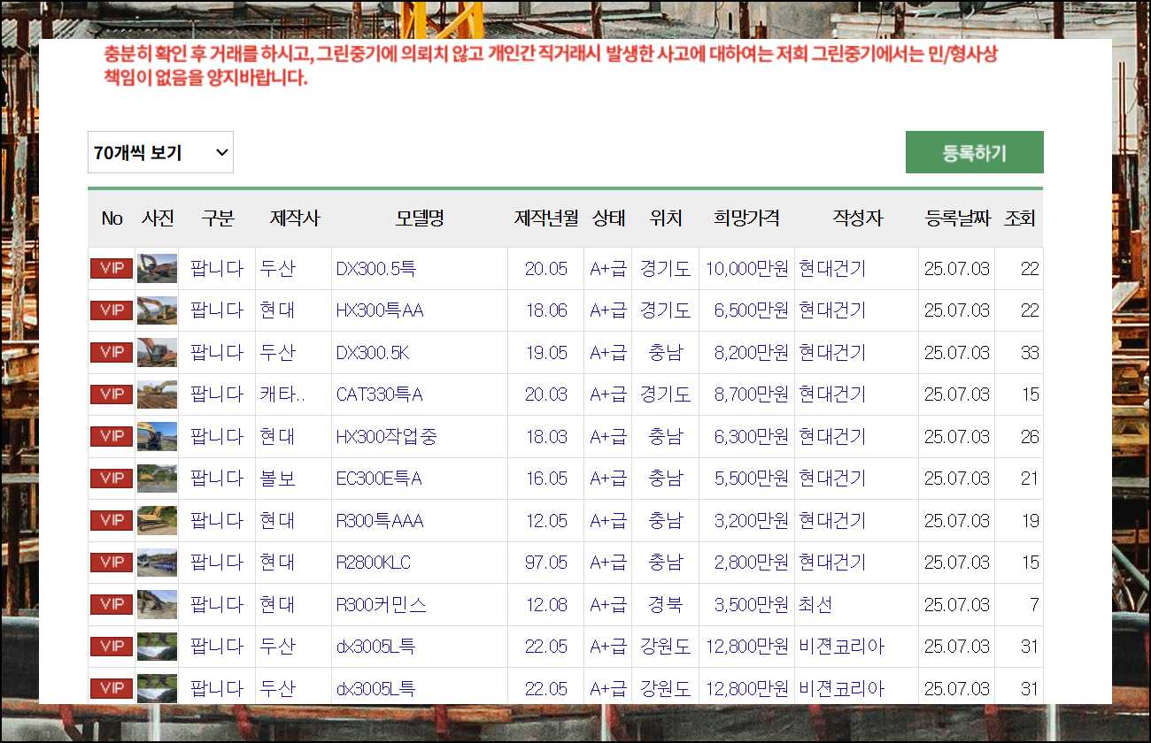 표 형태로 정리된 정보가 매우 유용해요. 모델명, 제작사, 제작년월, 상태, 희망 가격 등을 쉽게 확인할 수 있거든요. 그린중기는 이런 방식 덕분에 원하는 매물을 빠르게 찾을 수 있고, 관심 있는 매물끼리 비교도 가능합니다. 사진 자료도 충분히 제공하고 있어서 온라인에서도 어느 정도 상태 파악이 가능해요. 하지만 그린중기 매매상사를 통해 실제로 거래할 때는 반드시 매물을 직접 확인해보세요.