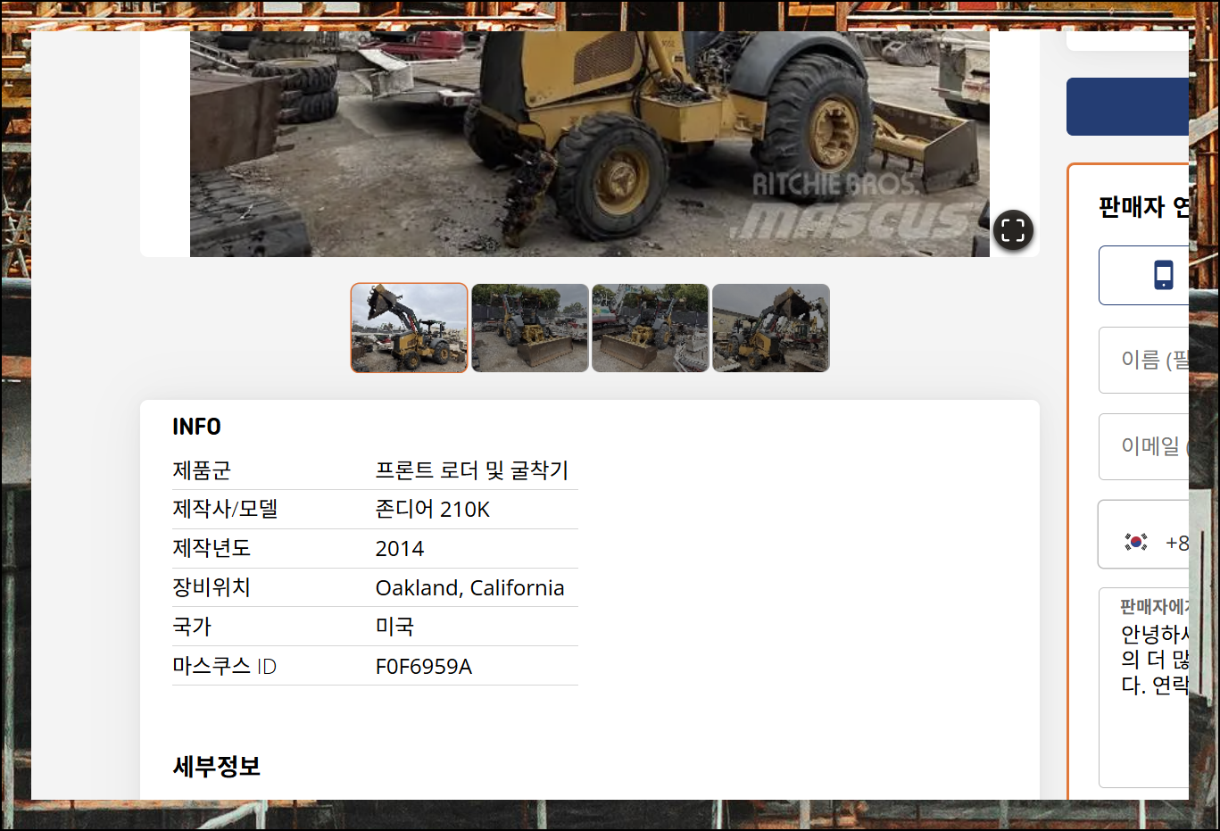 마스쿠스에서도 풍부한 사진과 함께 각 매물의 상세한 스펙 정보를 볼 수 있어요. 특히 중장비 사용 시간까지 표시되어 있어서 좋더라고요. 물론 사용 시간이 매물 상태를 완벽하게 보여주는 건 아니지만, 거래할 때 참고할 만한 정보라고 생각해요.