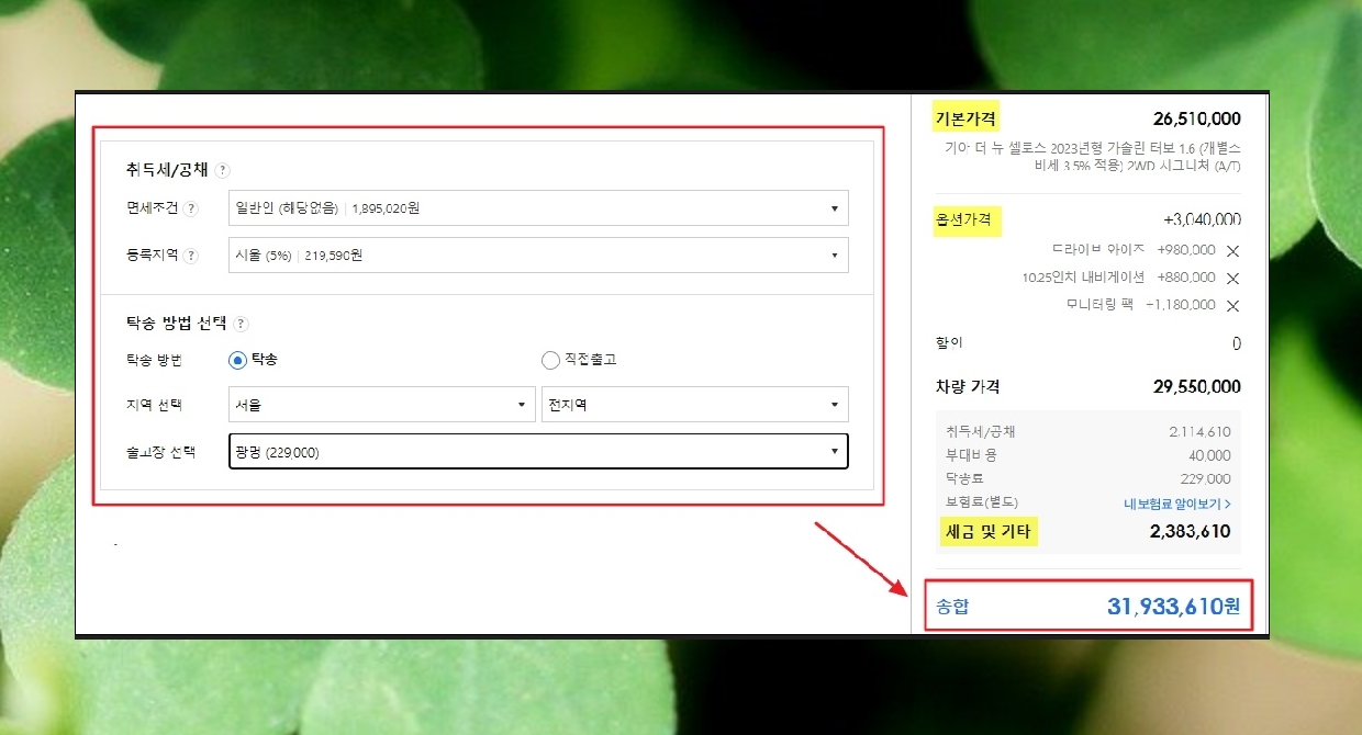 마지막으로 신차를 구입할 때 발생하는 세금, 탁송료 등의 기타 비용을 산정해야 하는데요. 간단하게 지역이나 이용하고자 하는 출고장 조건을 선택하면 됩니다. 그럼 화면 우측에 나온 결과를 통해 기아 셀토스에 대한 최종 구매 비용을 확인할 수 있어요. 저는 사람들이 선호하는 조건으로 가격표 이용을 해보았는데요. 최종 금액이 31,933,610원으로 되었네요. 이런 식으로 자신에게 맞는 조건을 선택하여 최종 구매 비용을 간단하게 알아볼 수 있습니다.