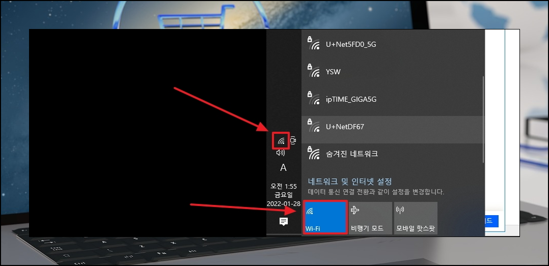 두 번째는 윈도우 OS 상에서 체크해야 할 사항입니다. 작업표시줄에서 네트워크 아이콘을 클릭해 봅니다. 그럼 새로운 창이 하나 나타나면서 노트북 인터넷 연결이 제대로 되고 있는지 확인이 가능합니다. 사용 가능한 공유기 리스트가 나오기 때문에 여기에서 마우스 클릭으로 선택해서 사용하면 됩니다. 아무리 해도 연결이 안될때 창에서 하단에 위치한 Wi-Fi, 비행기 모드, 모바일 핫스팟을 클릭해 봅니다. 파란색을 켜져 있는 것이고, 회색은 꺼져 있음을 나타냅니다. 잘 모르시겠다면 여러 번 눌러서 Wi-Fi만 파란색이 되도록 맞춰주시면 됩니다. 제가 알려드린 대로 했음에도 불구하고, 온라인 연결이 여전히 안될때 창 하단에 있는 "네트워크 및 인터넷 설정"을 클릭합니다.