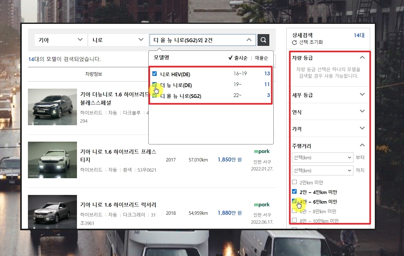 선택 목록에 것을 모두 선택합니다. 출시된 연도에 따라 이름이 살짝 다릅니다. 큰 틀에서는 같은 모델이지만, 작은 부분에서 업데이트 되거나 수정이 되었다고 합니다. 이렇게 하면 현재 기준으로 27건의 니로 하이브리드 매물을 만나볼 수 있습니다. 우측에 있는 상세 검색 기능을 통해 본인이 원하는 조건을 설정해 보시길 바랍니다. 저는 주행거리가 적당한 것을 좋아하기 때문에 2만에서 6만 킬로미터 정도 운행한 차량을 검색해 보았습니다.
