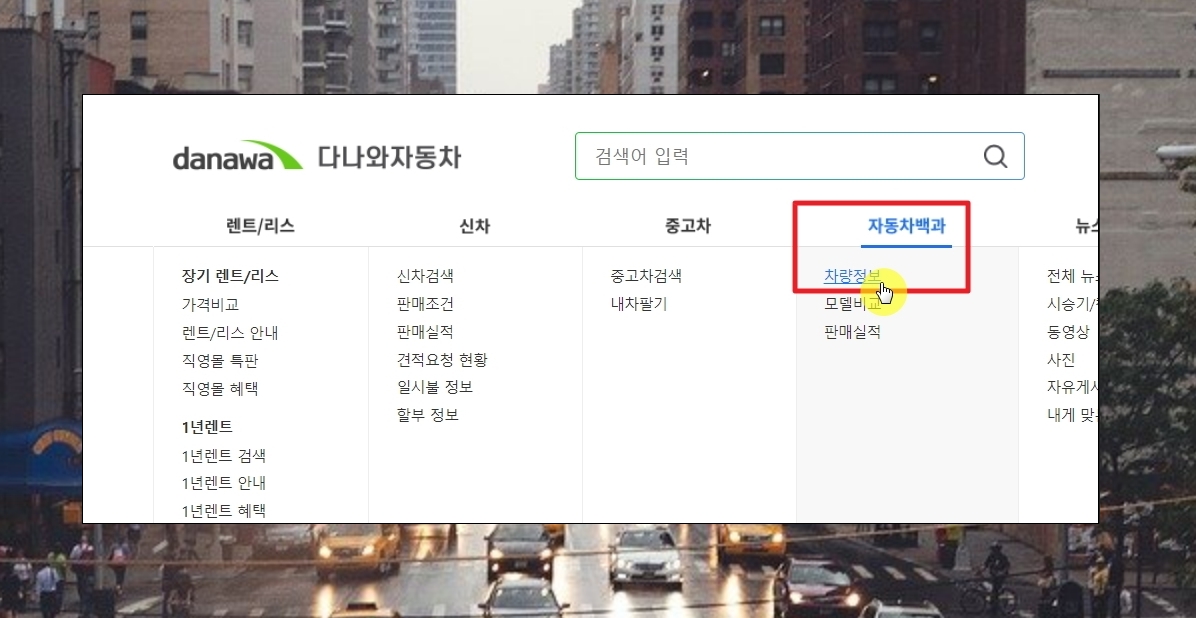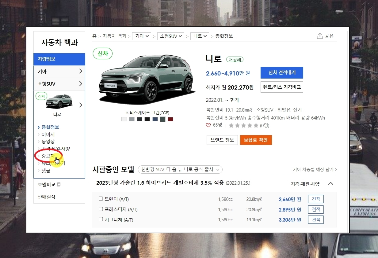 자동차 백과 페이지를 통해 상세 설명을 확인할 수 있습니다. 여기서 신차 정보는 물론이고, 이미지, 동영상, 가격, 제원, 사양 등의 정보를 얻을 수 있습니다. 좌측에 보면 차량정보 메뉴가 있는데, 여기에서 [중고차]를 클릭해 봅니다.