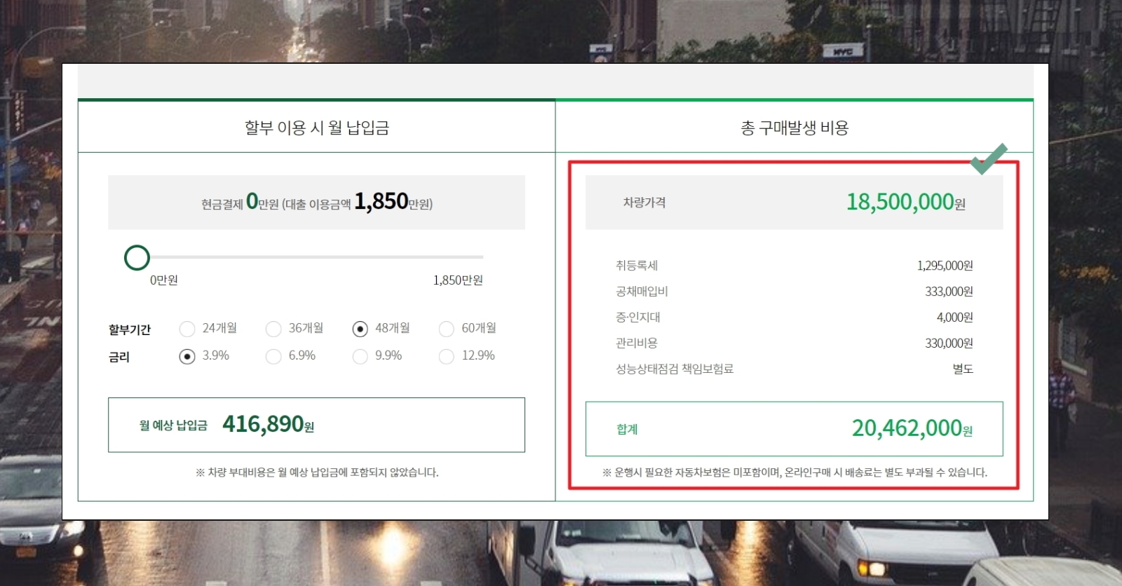 마지막으로 우리가 찾아본 니로 하이브리드 중고차 매물을 구입할 때 얼마의 비용이 발생하는지 알아볼 수 있습니다. 차량가격에 더하여 취등록세, 공채매입비, 인지대, 관리비용 등 놓치기 쉬운 비용들을 알아서 산출하여 알려줍니다.