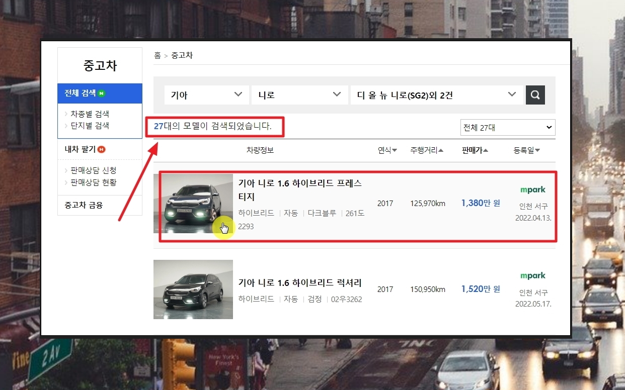 새롭게 열린 페이지를 통해 중고차 정보로 구성된 리스트를 살펴볼 수 있습니다. 최근에 나온 버전인 디 올 뉴 니로의 경우에는 출시가 된 지 얼마 안되었기 때문에 매물이 3개 뿐이 없습니다. 이 때에는 화면 상단에 있는 셀렉트 박스를 클릭해 보세요.