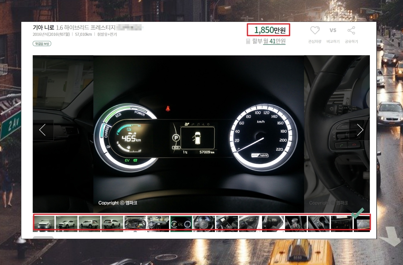매물 리스트에서 마음에 드는 것을 마우스로 클릭해 보세요. 그럼 다음과 같이 해당 매물에 관련된 많은 사진을 살펴볼 수 있습니다. 가격도 하이브리드 차량 치고 저렴하게 판매가 되고 있습니다.