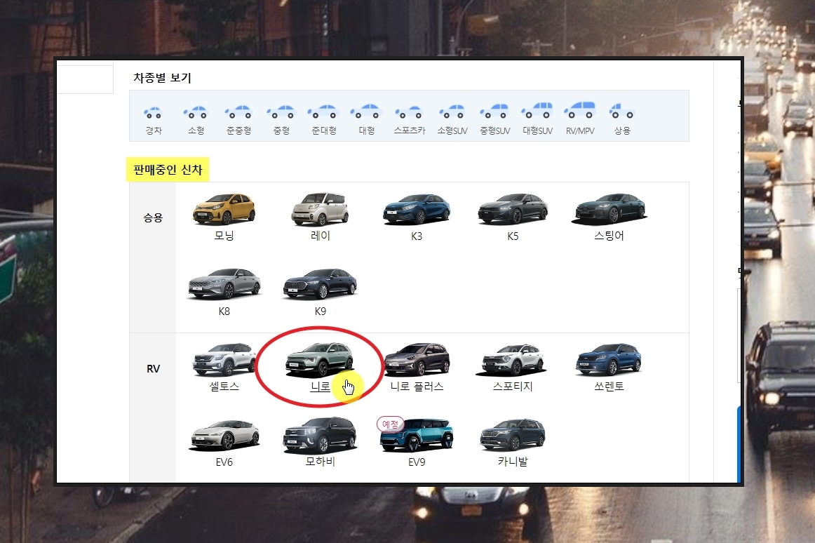 현재 기아자동차에서 판매중인 신차 목록이 나왔습니다. RV 시리즈를 보면 니로를 찾을 수 있습니다. 니로 외에도 셀토스, 스포티지, 쏘렌토, 모하비, 카니발 등을 클릭하면 이에 대한 가격도 알아볼 수 있습니다.