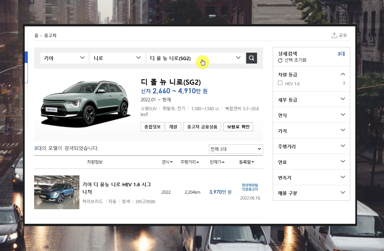 새롭게 열린 페이지를 통해 중고차 정보로 구성된 리스트를 살펴볼 수 있습니다. 최근에 나온 버전인 디 올 뉴 니로의 경우에는 출시가 된 지 얼마 안되었기 때문에 매물이 3개 뿐이 없습니다. 이 때에는 화면 상단에 있는 셀렉트 박스를 클릭해 보세요.