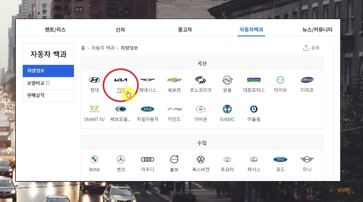 알아보고 싶은 차량에 대한 몇 가지 선택을 해야 합니다. 니로 하이브리드는 기아자동차에서 생산하는 차량이기 때문에 국산 카테고리에 있는 [기아]를 선택합니다.