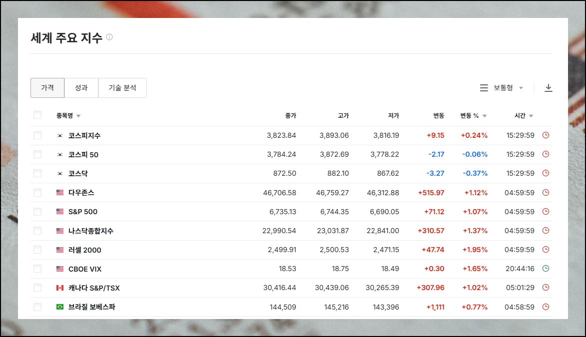 세계 주요 지수 페이지로 이동하게 됩니다. 여기서 다우지수의 현재 시세를 실시간으로 확인할 수 있어요. 장이 끝난 상태라면 마감 당일 기준으로 종가와 고가, 저가는 물론 전일 대비 변동 금액과 등락률까지 한눈에 볼 수 있습니다. 화면에는 나스닥 종합, S&P 500, 러셀 2000 같은 미국의 대표 지표들도 함께 나타나요.