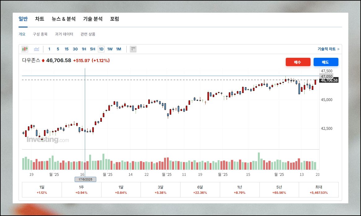 표에 나타난 다우존스 항목을 클릭하면 더욱 상세한 화면으로 넘어갑니다. 상단 메뉴를 살펴보면 과거 데이터, 관련 금융상품, 기술적 분석 결과, 최신 뉴스 등이 준비되어 있어요. 각 메뉴를 차례로 눌러보면 다우지수 관련 실시간 정보를 여러 관점에서 파악할 수 있습니다.