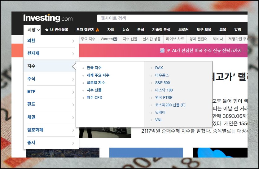 다우지수의 실시간 정보를 확인할 수 있는 웹사이트가 있습니다. "인베스팅"이라는 플랫폼인데요. 별도의 가입 절차 없이도 대부분의 시세 데이터를 자유롭게 볼 수 있어요. 홈페이지에 접속한 뒤 상단에 있는 시장 메뉴를 눌러보세요. 다우존스뿐 아니라 전 세계 주요 지표, 환율, 개별 종목, ETF까지 폭넓은 금융 정보를 제공합니다. 그중에서 세계 주요 지수 항목을 선택해주세요.
