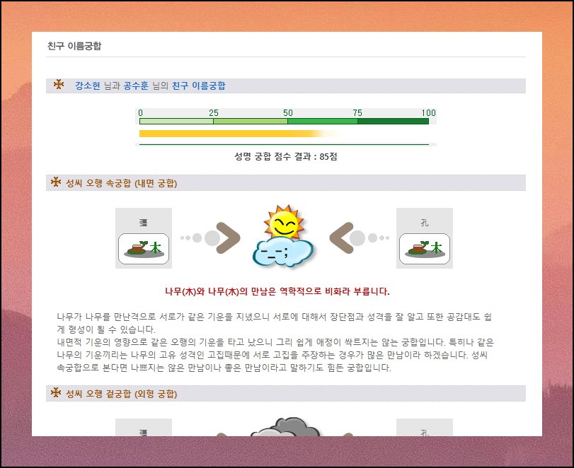 친구 사이 진행할 수 있는 궁합보기 서비스도 무료로 이용할 수 있습니다. 성씨와 이름만 정확하게 입력하면 되는데요. 친구와의 유대감을 더 깊이 이해하는 데 유용한 정보를 얻을 수 있어요.