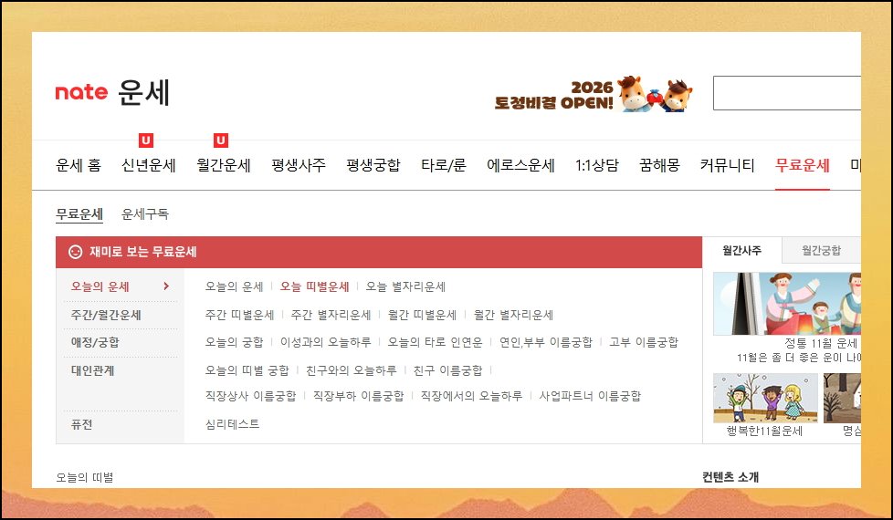 다음 포털에서 네이트 운세를 검색해보세요. 이곳은 돈 들이지 않고 다양한 역술 콘텐츠를 경험할 수 있는 곳입니다. 서비스 퀄리티가 뛰어나면서도 무료라는 게 가장 큰 매력이죠. 많은 분들이 계속 찾는 이유는 풍성한 콘텐츠 덕분인데요. 특히 사람과 사람 사이 관계를 이해하는 데 실질적인 도움을 주는 프로그램들이 가득합니다.