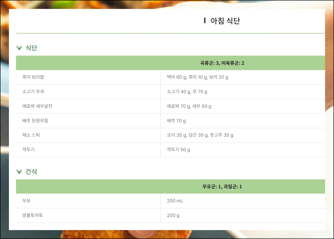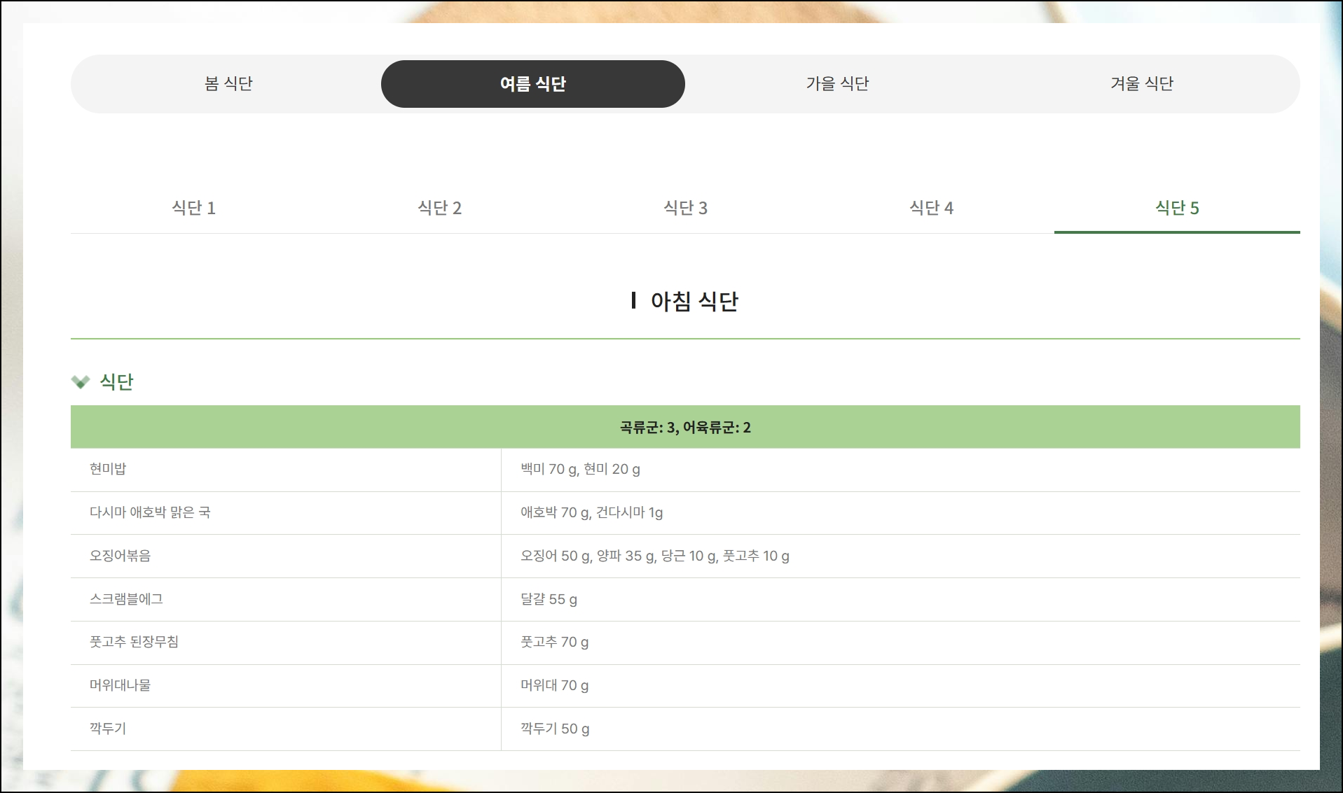 웹사이트의 식생활 관리 섹션에 들어가면 사계절별로 다른 건강 식단표 자료를 살펴볼 수 있어요. 이런 다양한 옵션을 참고해서 개인의 상황에 가장 적합한 1주일 계획을 수립해보세요. 매 식사 때마다 무엇을 준비할지 고민하는 스트레스에서 벗어날 수 있어요.