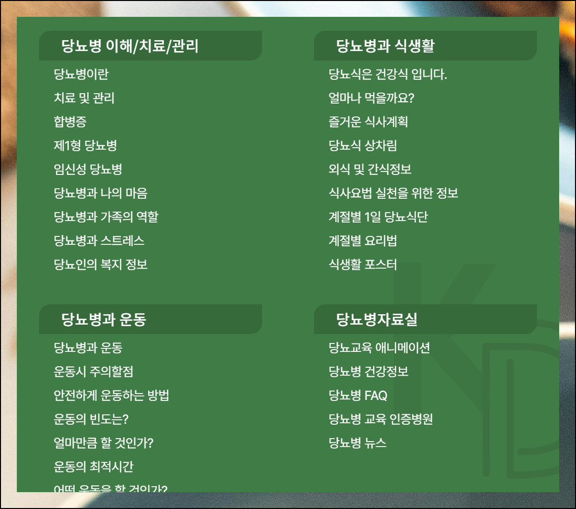 해당 웹사이트에 접속해서 일반인 대상 메뉴 카테고리를 선택하면 필요한 자료를 빠르게 확인할 수 있어요. 1주일 분량의 당뇨 관리 식단표를 짜는 데 필요한 모든 데이터가 체계적으로 정리되어 있어요. 여러 곳을 찾아다닐 필요 없이 이곳에서 모든 내용을 얻을 수 있어요.